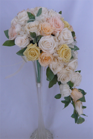 白・ピーチ・黄色バラ キャスケードブーケ |