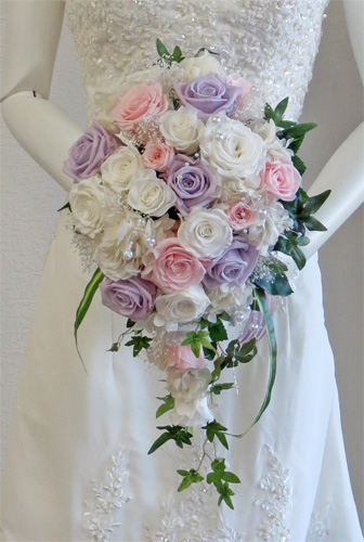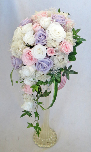 白・ピンク・淡パープルバラ パールキャスケードブーケ |