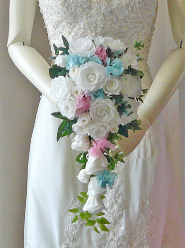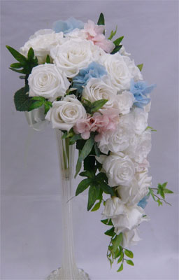 ホワイトローズ・ピンク、ブルーあじさい キャスケードブーケ |