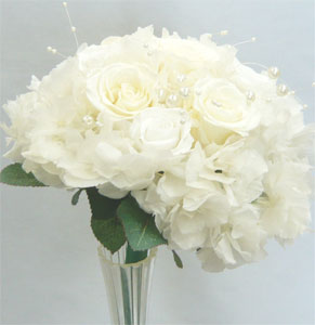 バラ・あじさい〔プリザーブドフラワー〕、葉[アートフラワー]、パール |