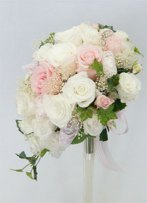 白&ピンクローズとかすみ草 オーバルブーケ |
