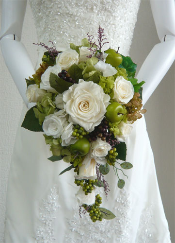 白バラ・グリーンアジサイ 実のキャスケードブーケ |
