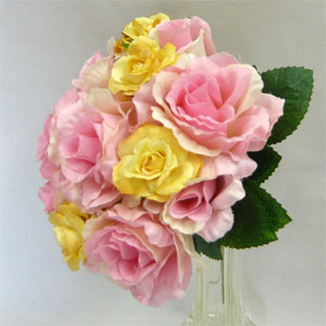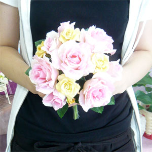 造花トス用ブーケ ピンク&イエローローズ ブートニア付き