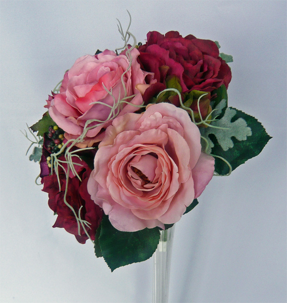 ワイン・ピンクカラーバラのラウンドブーケ ヘッド付き |